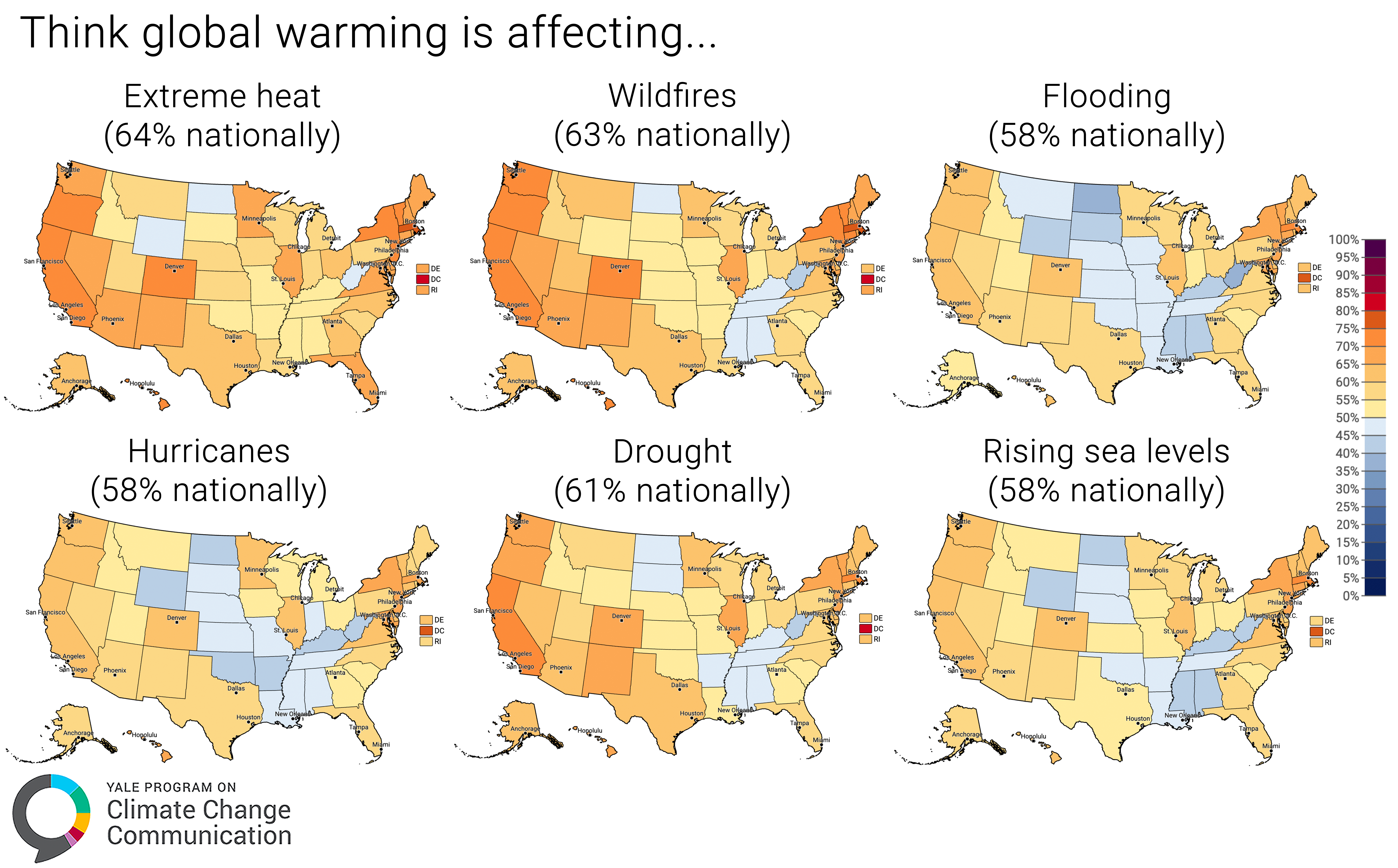 The maps show that majorities of Americans think global warming is affecting extreme heat (64%), wildfires (63%), droughts (61%), flooding (58%), hurricanes (58%), and rising sea levels (58%). However, they also show that levels of public understanding about climate change attribution differ across the country. (Fig. 1).