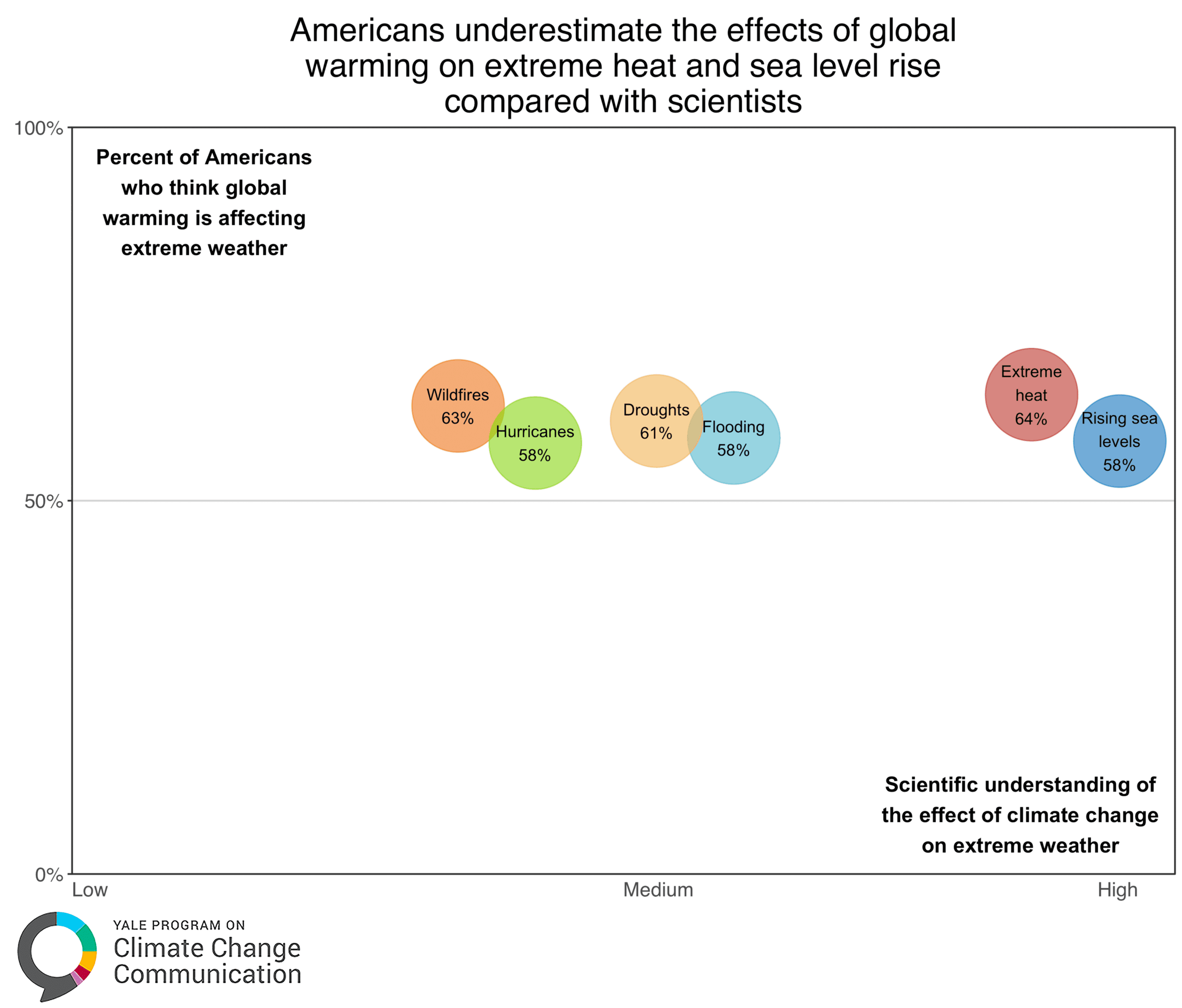- Majorities of Americans think global warming is affecting extreme heat (64%), wildfires (63%), drought (61%), flooding (58%), hurricanes (58%), and rising sea levels (58%).