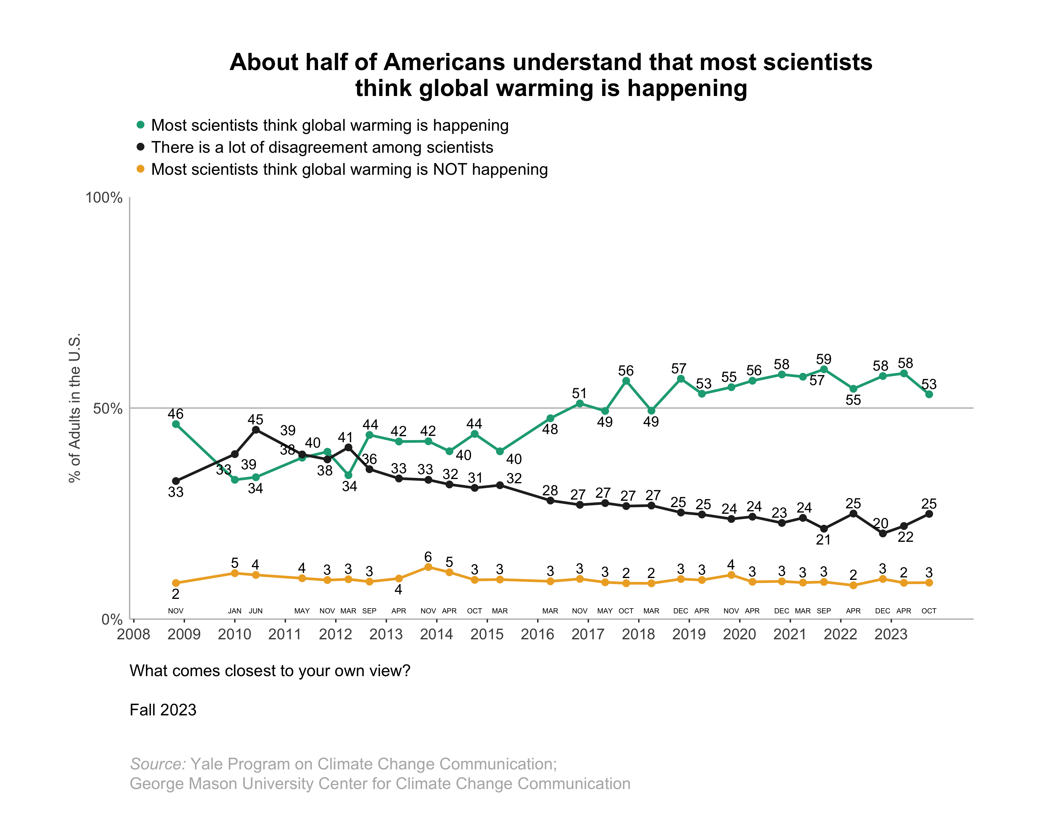 This line graph shows the percentage of Americans over time since 2008 who understand that most scientists think global warming is happening. About half of Americans understand that most scientists think global warming is happening. Data: Climate Change in the American Mind, Fall 2023. Refer to the data tables in Appendix 1 of the report for all percentages.