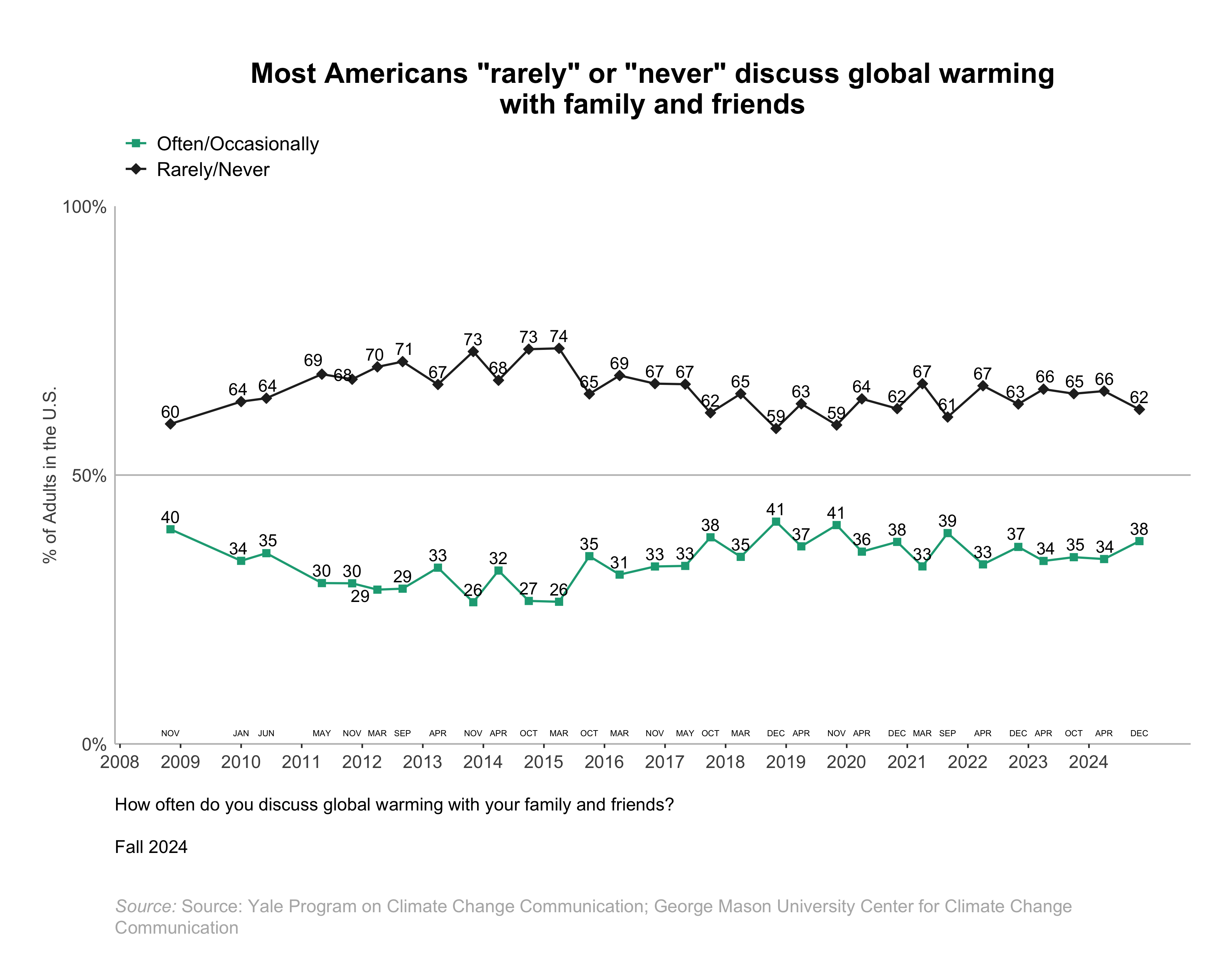 This line graph shows the percentage of Americans over time since 2008 who "often" or "occasionally" vs. "rarely" or "never" discuss global warming with family and friends. Most Americans "rarely" or "never" discuss global warming with family and friends. Data: CCAM, Fall 2024. Refer to the data tables in Appendix 1 of the report for all percentages.