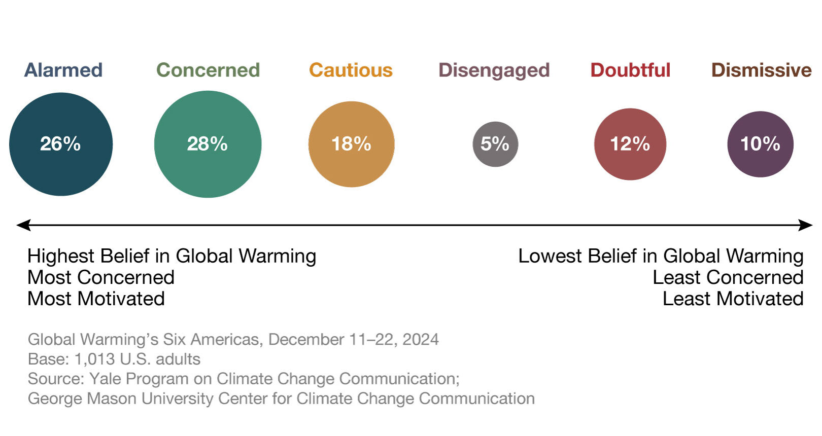 This bubble chart shows the percentages of Americans in each of Global Warming’s Six Americas. Alarmed Americans outnumber the Dismissive (10%) by a ratio of about 2.5 to 1. Source: Climate Change in the American Mind, Fall 2024. Refer to the Data Tables for Accessibility for all percentages.