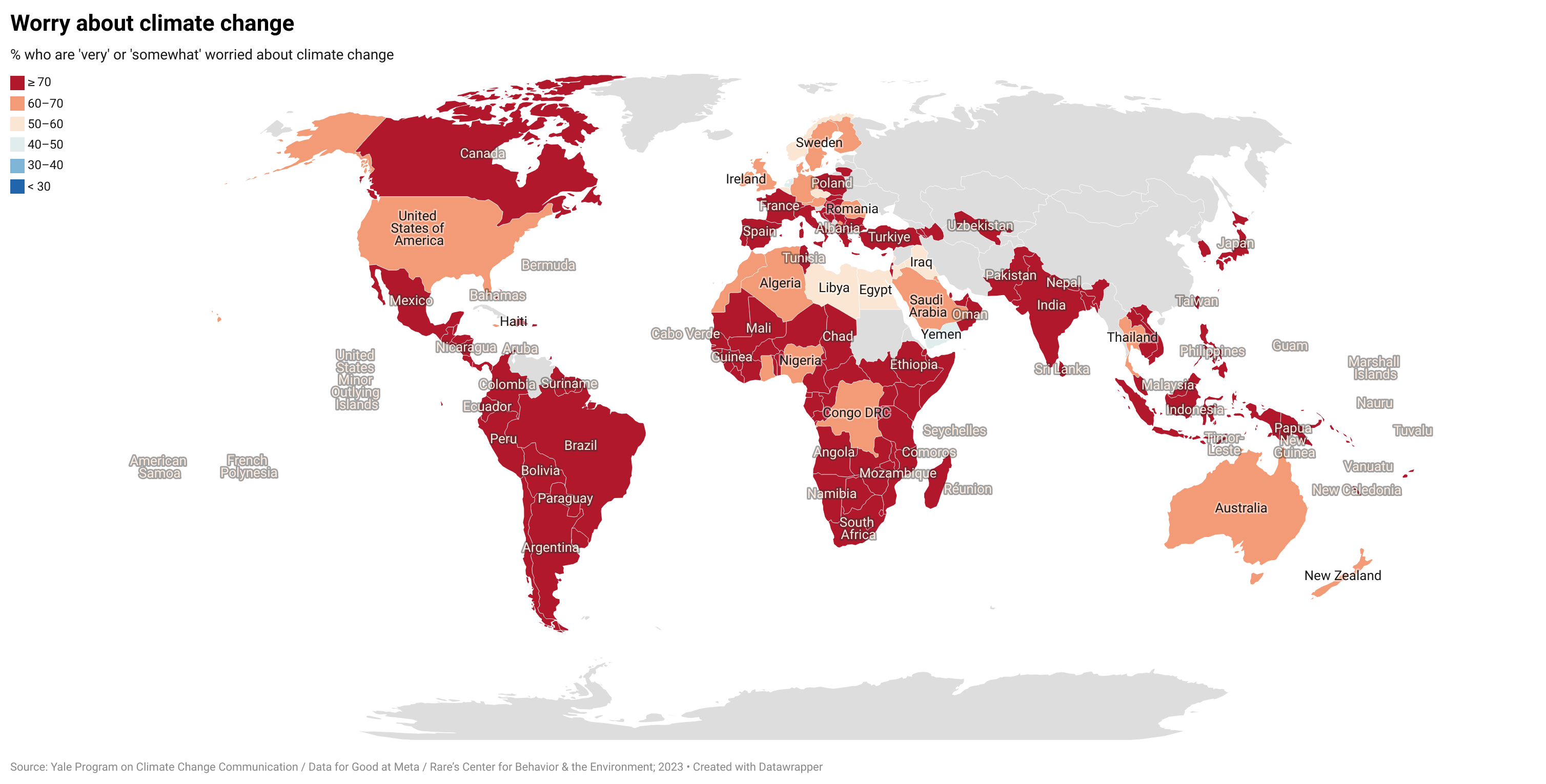 This world map shows the countries and territories where a majority of respondents say they are "very" or "somewhat" worried about climate change. A majority of respondents in nearly every area are worried about climate change. Data: International Public Opinion on Climate Change, 2023.